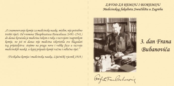 OGLASNA PLOČA 3. dan Frana Bubanovića Čast nam je i zadovoljstvo pozvati Vas na 3. dan Frana Bubanovića u petak 20. studenog 2015. godine, s početkom u 12:00 sati u dvorani „Fran Bubanović” Zavoda za kemiju... Objavljeno 29.10.2015.