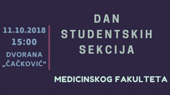 NOVOSTI [STUDENTI] Dan studentskih sekcija Medicinskog fakulteta Dan studentskih sekcija Medicinskog fakulteta se održava 11. listopada u 15:00 u dvorani „Čačković“.Studenti imaju jedinstvenu priliku poslušati zanimljiva predavanja... Objavljeno 28.09.2018.
